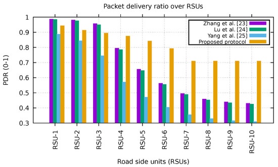 Figure 9 shows the PDR ratio of our proposed protocol over 10 RSUs on different distances. In the beginning, the PDR value is low due to an increasing number of hops between vehicles and RSUs, while the protocol needs to complete a route-finding process before packets can be successfully transferred. The stable PDR results are obtained between RSU-1 and RSU-5, but a consecutive slump in the packet delivery between RSU-6 and RSU-10. As a result, we can see that RSU-1 has the highest PDR due to its nearest distance in this scenario. Besides, RSU-10 as the farthest distance has the lowest PDR caused by the fading channel’s effect.