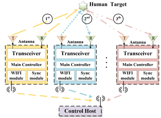 As shown in Figure 1, the architecture of the proposed wireless-netted multi-observation point detection system includes several independent single-channel Golay complementary coded UWB life-detection radars, which are taken as the network nodes controlled by a control host. The radars are responsible for the generation, transmission and reception of the Golay complementary coded signal. The detailed design of the system is discussed in Section 3. The control host is responsible for the human–machine interface, collaborative acquisition and data processing. By using time division multiplexing (TDM) and the star topology, the control host coordinates these network nodes during the multiple observation point detection process to prevent mutual interference.