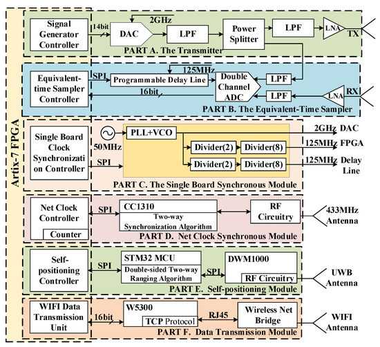 As shown in Figure 2e, the self-positioning module is composed of a DWM1000 ultra-wideband module, an STM32 Microcontroller Unit (MCU) and a self-positioning controller in FPGA. The DWM1000, as the key component of the self-positioning module, is designed based on Decawave’s DW1000 chip. It integrates antenna, all RF circuitry, power management and clock circuitry into one module, supports four radio frequency bands from 3.5 GHz to 6.5 GHz, provides the function of timestamping and precise control of transmission times and can be used in the two-way ranging or Time Difference of Arrival (TDOA) positioning with an error within 10 cm [29,30,31,32]. Here, the two-way ranging is realized by the double-sided two-way ranging algorithm executed in the STM32 MCU to achieve the self-positioning of the radars.
