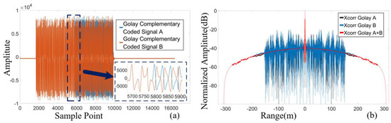 (a) The Golay complementary coded signal sampled by the receiver. (b) The autocorrelation result of Golay code A, Golay code B and the sum of both.