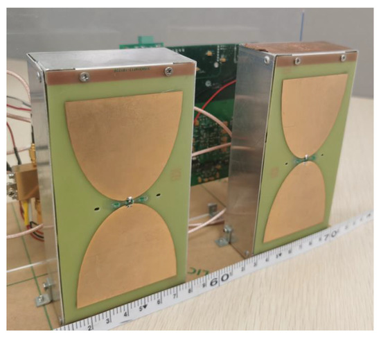 The size of antennas is essential in radar design. A miniaturized radar is more adaptable to the environment. A certain compromise was made in this work between bandwidth and efficiency when designing the antenna to meet the requirements of using the ultra-wideband and having a miniaturized size. Large bandwidth and high efficiency can be obtained in a smaller size by using a bow-tie antenna. The top-layer patch of the antenna has a semi-elliptical shape, meaning that the current flows through a longer path in a small size. Simultaneously, an elliptical end is added to the bottom layer, coinciding with the top layer. By loading resistors on the bottom side, the current is coupled through the substrate for further absorption, which improves the radiation efficiency of the antenna. The use of a metal back cavity can also enhance the antenna’s forward radiation ability while further improving the isolation of the transmitting and receiving antenna and the SNR of the radar system. The size of a single antenna is 140 mm × 70 mm × 35 mm, as Figure 4 shows, and the operating band is 0.5–1.5 GHz.