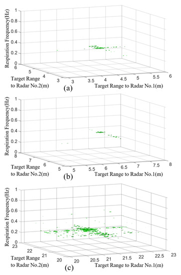 According to our proposed multi-observation point detection method, when weak respiration movement is present, a new type of VSFs of the tested human subject may appear in the output cross-correlated range–frequency 3D image. The three dimensions of the output cross-correlated range–frequency 3D image represent the range from radar No.1, the range from radar No.2 and the respiration frequency, respectively. As shown in Figure 8a–c, by finding a suitable threshold, the VSFs for the three types of experiments are remarkable. The respiration frequencies indicated by the VSFs are 0.32 Hz, 0.3 Hz and 0.28 Hz, respectively, which are consistent with the actual situation. To further understand the VSFs in the output cross-correlated range–frequency 3D images, 2D slice (range × range) images corresponding to the specific respiration frequencies of 0.32 Hz, 0.3 Hz and 0.28 Hz are presented in Figure 9a–c, respectively.