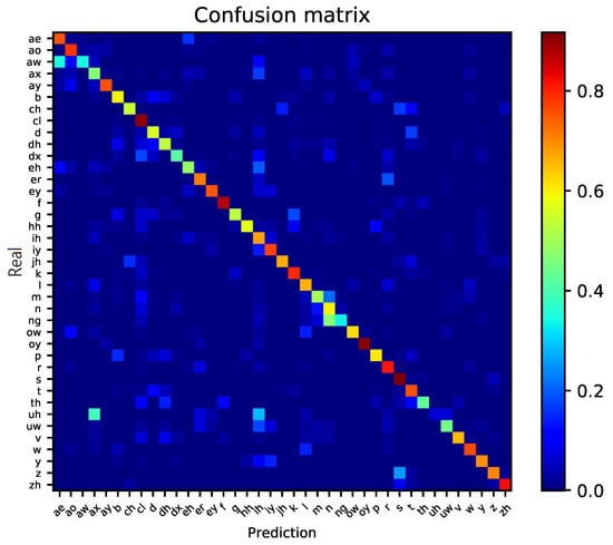 A confusion matrix is a table of comparison results for the predicted and actual values to analyze intra-class and inter-class performances. It is used to evaluate the performance of supervised learning, such as classification in machine learning [39]. After training the baseline phoneme classification model, on a test set we evaluate phoneme classification accuracies and create a confusion matrix. Figure 1 shows the obtained confusion matrix from baseline phoneme classification results for 39 mapped phonemes. The y-axis is the real labels of the given phonemes, and the x-axis is the predicted labels from the baseline RNN. Each element of the matrix, denoted by where i and j are row and column numbers, respectively, is the rate of predicting phoneme j when the actual one is i. According to the definition of the confusion matrix, the diagonal elements () are the correct classification rates for individual phonemes and all off-diagonal elements () are ratios of incorrect classification pairs. For example, the first column of the the third row, , is brighter than the nearby components with the of the exception diagonal ones. It means that the phoneme [aw] is misclassified a lot to the phoneme [ae]. Among off-diagonal elements, ([uh], [ax]), ([uh], [ih]), ([n], [m]), and ([z], [s]) are examples of phoneme pairs with high misclassification rates.