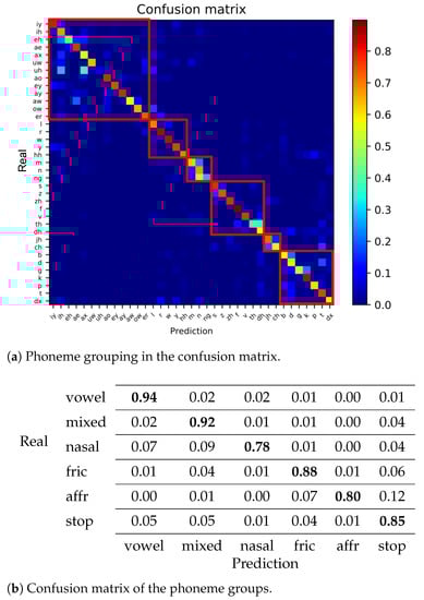 To confirm that the phoneme categories are well clustered, we drew a confusion matrix with the new phoneme groups in Table 3, and it is shown in Figure 3a. The phonemes are reordered so that all the phonemes in the same group are located adjacently. The red-colored rectangles indicate phoneme groups, and Figure 3b is the table below the figure is a confusion matrix with the phoneme groups as classification targets. The diagonal ones represent that the accuracy of the group labeling is very high, which implies that the different groups are well distinguished. In other words, the phonemes within the same group are similar and confusing, so we focus on improving the recognition performance of these phonemes inside the groups.