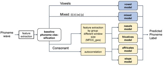 As described in the previous section, we focus on making a better decision on consonants rather than on vowels. Consonants show various types of energy distributions in phoneme groups. Therefore, we implement appropriate models for individual consonant phoneme groups and verify their performance. MFCC_gws is a feature extraction method with group different window sizes, as well as autocorrelation features added to help distinguish voiced phonemes and unvoiced phonemes within the consonant group. By combining the two features [51], three phoneme group models are created.