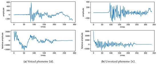 Algorithm 1 is the pseudo code for the autocorrelation computation. The array x is the speech signal, N is the size of signal, and the autocorrelation function is denoted by . Figure 6a shows the waveform of a voiced consonant phoneme [d] and its autocorrelation computed by Algorithm 1. Likewise, Figure 6b is for an unvoiced consonant phoneme [t]. The autocorrelation of phoneme [d] shows nonzero values, while that of phoneme [t] has almost zero, meaning that there is no significant pitch. From these results, autocorrelation can help in distinguishing voiced and unvoiced phonemes.