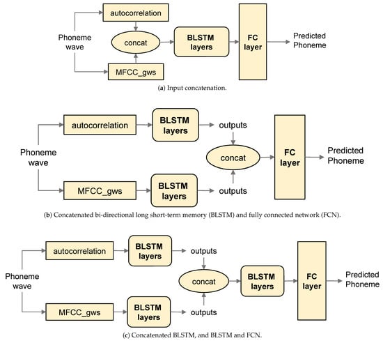 Various types of the consonant group models with additional autocorrelation features. (a) input features are concatenated. (b) BLSTM outputs are cocatenated. (c) another BLSTM layer is added for the concatenated BLSTM outputs.