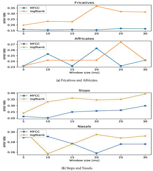 We compared the performance of two commonly-used features in speech recognition. The first one is mel-frequency cepstral coefficients (MFCCs) and the other one is log filterbank energies. Figure 8 shows the performance differences of four phoneme groups according to the change of window sizes. Blue lines are MFCC results and orange lines are the results of log filter bank energy features [37,38,52]. In most cases, blue lines are below orange lines, showing less phoneme recognition errors. Based on these results, we chose MFCC in the phoneme group models and the overall model.
