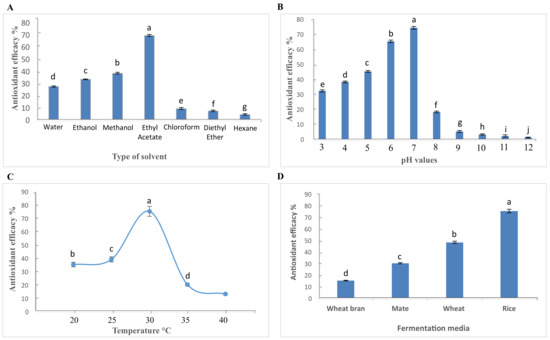 (A) Effect of using different solvents on the effectiveness of antioxidant compounds of fermented rice (koji) inoculated with A. flavus following 15-days of incubation at 30 °C. (B) Effect of different pH values on the effectiveness of antioxidant compounds of fermented rice (koji) inoculated with A. flavus following 15-days of incubation at 30 °C. (C) Effect of different temperatures on the effectiveness of antioxidant compounds. Compounds of fermented rice (koji) inoculated with A. flavus following 15-days of incubation at pH 7. (D) Effect of different fermentation media on the effectiveness of antioxidant compounds of fermented rice (koji) inoculated with A. flavus following 15-days of incubation at 30 °C. * The different letters indicate significant differences at the probability level p < 0.05.