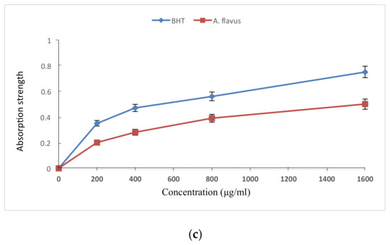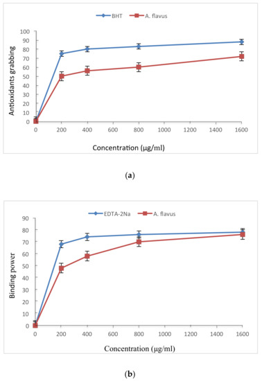 Table 1 shows that BHT had a significantly higher (p < 0.05) antioxidant efficacy (85.2%) as compared to α-tocopherol (82.0%) and A. flavus (73.1%). The obtained results exhibited a significant difference (at p < 0.05) in the antioxidant effects of the three antioxidants. The effectiveness of antioxidants increases as the extract contains large quantities of antioxidant compounds [39]. Therefore, the effectiveness of antioxidant compounds increased by plant isoflavones, which were released during the fermentation process [50]. As shown in Figure 2, at all concentrations, the A. flavus extracts were almost as strong (only marginally inferior) than controls BHT and EDTA-2Na in terms of free radical scavenging activity, iron-ions binding efficiency, and reducing power capacity, when compared to the extract obtained from fermented rice koji inoculated with A. flavus. In each of the above three parameters tested, a logarithmic increase was observed that proportionally increased with the increasing concentration. This is in agreement with previous studies [51,52,53] which confirmed that antioxidant compounds of fermented rice (koji) using A. flavus have the ability to donate a hydrogen atom and thereby prohibit free radicals. This is also in agreement with previous studies [42,43,54], which demonstrate that the compounds of microbial antioxidants increased logarithmically with the concentration. A significant increase (p < 0.05) in the reduction power was observed while increasing the concentration, which is consistent with the reported observations [55]. The presence of compounds may explain the observed reduction strength of the extract which are formed during the fermentation process and can interact with free radicals to be converted into more stable products and therefore terminate the free radical reaction chain [56], while the reductase compounds interact with the peroxides and inhibit their formation.