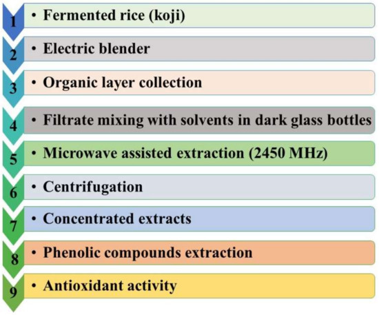 The primary extraction of antioxidants along with bioactive compounds involved mixing the fermented rice (koji) (obtained in Section 2.2.) in an electric blender with 100 mL of ethyl acetate. This mix was then filtered through Whatman no.1 filter paper and washed three times. The filtered organic extract was used for further extraction. An extraction method described earlier [31] using 90 °C for extraction with Teflon tubes (3 cm-diameter, 20 cm long, and 5 mm thickness) was used. Ten milliliters of the filtered organic extract was then taken and put in dark glass bottles as photodegradation of phenolics occurs due to light [32]. Next, 40 mL of different solvents (distilled water, ethyl acetate, hexane, ethanol, chloroform, diethyl ether, and methanol) were added. Each of the filtered organic extract were mixed with the solvent above using the magnetic plates for 30 min and then transferred to the Teflon tubes and sealed tightly and placed in the microwave device (capacity 2 L, MARS 6, CEM Corporation, Matthews, NC, USA) using a frequency of 2450 MHz and a power of 500 W for 20, 30, and 40 s. Next, centrifugation was performed in tubes at 600 g for 15 min. The filtrate was concentrated using the rotary vacuum evaporator at 40 °C to reduce the solvents to a final volume of 10 mL. The extracts were kept at −18 °C for further use.