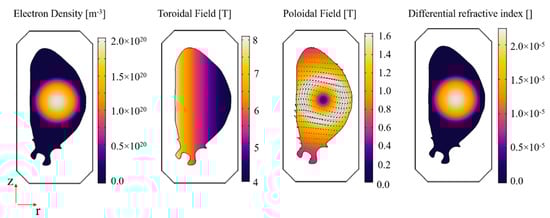 The plasma used for the numerical simulation has been built applying a circular equilibrium type, widely used in the literature for the investigation of polarimetry performances. The electron density and temperature of the plasma have a parabolic profile. Defined by the dimensionless minor radius , where r is the minor radius coordinate and a is the minor radius of the plasma, the electron density can be written as and the electron density is , where N0 is the electron density on the magnetic axis of the plasma. The toroidal field, defined by its value B0 on the major radius R0, has the form . The profile of the plasma current density has a parabolic profile as well and it is calculated from the plasma current (Ip) as . The poloidal field is calculated from the integration of the current density and it is . Then, the refractive index field is computed (see Section 2, Equation (7)). Figure 2 shows the field of the electron density, toroidal and poloidal magnetic field, and of the differential refractive index, defined as the vacuum refractive index minus the plasma refractive index.
