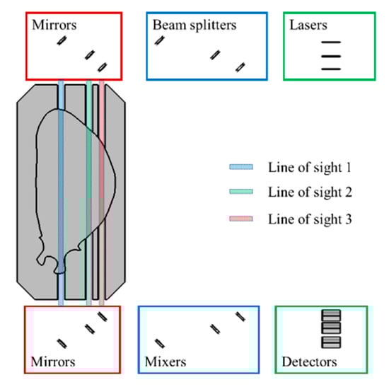 The numerical simulations of the interferometer have been performed by placing three vertical lines of sight, as shown in Figure 3. Three lasers emit beams with a wavelength of 20 μm and each laser emits 100 rays. Each beam interacts with a 50–50 beam-splitter. Thus, half of the rays are reflected, while the others are transmitted. The transmitted rays interact with the mirrors on the top of the tokamak and enter in the vessel, probe the plasma, exit from the vessel and are reflected by the mirrors placed below the vessel. Then, they pass through the beam mixers and are collected by the detectors. The reflected rays from the beam-splitters represent the “reference” beams, used to measure the differential phase. They are reflected by the mixers and collected by the detectors.