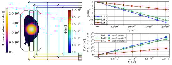 Nine numerical simulations were performed changing the electron density to simulate different plasma conditions, from the absence of the plasma to the flat top condition. The electron density (N0) goes from 0 to 2 × 1020 m−3. Figure 4 shows the results of the numerical simulations. The figure on the left represents the ray trajectories from the laser to the detector, where the ray colour shows the calculated phase according to Equation (8). Since the “reference” and the “plasma” beams run different distances, the interferometer must be calibrated in the absence of plasma (numerical simulation number 1). Thus, knowing the phase difference in the absence of plasma, the phase difference due to the plasma is calculated and the electron density as well, from Equation (10). The figure on the right-top represents the calibrated differential phase for all lines of sight, where the phase for N0 = 0 m−3 has been placed equal to zero (calibration). The figure located at the right-bottom shows the true electron density, calculated as the integral on the line of sight of the electron density field, and the electron density calculated by the interferometer, through the phase difference. The comparison clearly shows that the methodologies implemented to model the interferometer in COMSOL work properly.