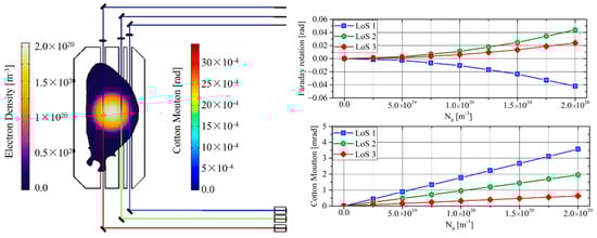 Analogue numerical simulations were performed to test the polarimeter model, where the plasma current scales accordingly to the electron density. The geometry is similar to the interferometer one, where the reference beam is not needed. The three lasers emit beams with a wavelength of 20 μm, and each beam is reflected by a 45° mirror. Then, they cross a linear polariser (Figure 5) which sets the polarisation of the probing beam (in the numerical simulation, a linear polarisation with 45° has been used, since this configuration maximizes the accuracy and the amount of information which can be extracted from the polarimeter, as discussed in the literature []). The rays then cross the plasma and their polarisation changes accordingly with Equation (17). The effect of the mirror and linear polariser on the polarisation of the ray are considered implementing the Mueller matrix of each component on the numerical simulation. The left plot of Figure 5 shows the ray trajectories, while the colour of the ray represents the local Cotton–Mouton phase shift. Note that the influences of the mirrors are not represented in the figure, in order to highlight the plasma effect, while for the proper calculation of the plasma parameters from the polarimeter, a calculation of the Mueller matrix (or Jones matrix and others) of the optics must be performed to ensure accurate results. For example, the polarimeter of JET performs a polarisation calibration in the absence of plasma before each plasma discharge. In these numerical simulations, the effects of the optics are calibrated with the first numerical simulation, when there is no plasma.