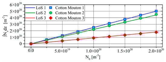 Validation of the Stokes model can be performed by measuring the line integral of the electron density with the Cotton–Mouton phase shift, by using the type 1 approximation shown in Equation (15). Figure 6 shows the results of this comparison, also demonstrating that the polarisation model works properly. Contrariwise, the Faraday rotation also is proportional to the poloidal field (along the propagation direction), making the direct measurement of the electron density difficult. However, being that the Cotton–Mouton and the Faraday rotation are linked by the system of Equation (17), a validation on the Cotton–Mouton directly involves the proper propagation of the Faraday rotation.
