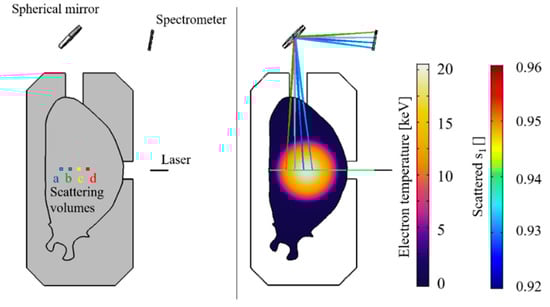 The numerical simulations to validate the Thomson scattering model were performed changing the geometry according to Figure 7. The light beam, generated by the laser, crosses the plasma. The laser wavelength is 1064 nm, while the peak power is 5 × 108 W (note that the TS diagnostic requires a pulsed laser with high peak power). Four different scattering volumes were placed along the direction of the laser beam and accumulate the variables needed for the scattering simulation. For each wavelength, the scattering volumes release rays with a specific solid angle aperture. The rays cross the plasma, exit the vacuum vessel, interact with the spherical mirror on the top of the tokamak and the rays are collected by the spectrometers, one for each scattering volume.