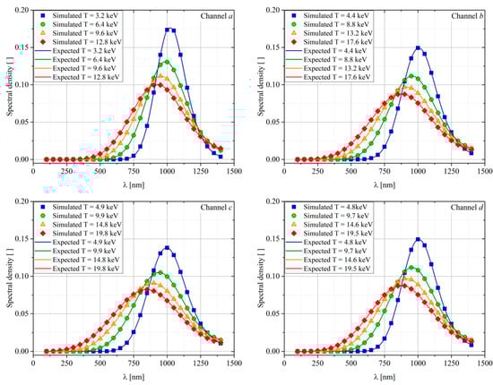 Thomson scattering expected and simulated adimensional spectra of the four channels as a function of the temperature.