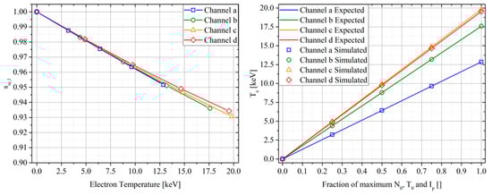 Thus, knowing the scattering angle and measuring the first component of the scattered Stokes vector, the temperature can be directly measured. Figure 9 (left) shows the first component of the reduced Stokes vector of the scattered light for the four channels as a function of the electron temperature. Note that the points do not lie on the same line because of the different scattering angle. The other two Stokes components are not shown since they are equal to zero (as expected when the input polarisation has a Stokes vector equal to [1, 0, 0]). Figure 9 (right) shows the expected electron temperature vs. the “measured” temperature by Equation (24) using the first component of the reduced Stokes vector. Even in this case, the measured temperature coincides with the expected one, validating the proper functioning of the simulation.
