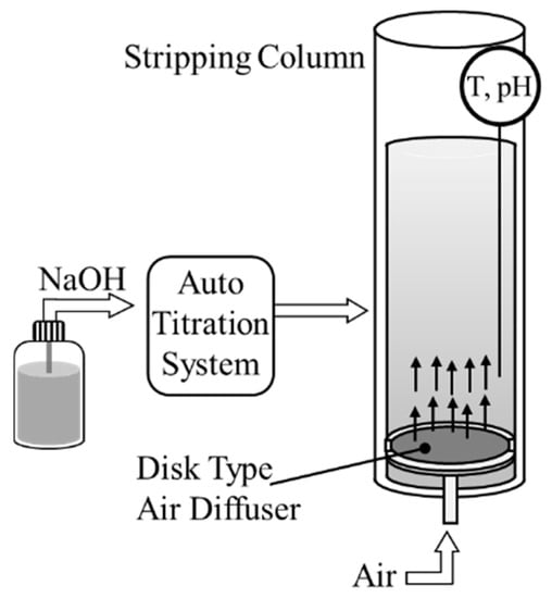 A column-type ammonia stripping device was configured as shown in Figure 1. The capacity of the column was 2 L, and a disk-type air diffuser was installed at the bottom, through which external air could be supplied. The air required for stripping was controlled at a pressure of ≤30 Pa using a blower and regulator, and a flow meter was used to control the volume. To control the pH of the solution, NaOH solution was supplied using an auto titration system (905 Titrando, Metrohm AG, Switzerland). Stripping was performed on 1 L of artificial wastewater, and the air flow rate was set to 900 L/h. The stripping factors were assessed while varying the ammonia concentration and the pH of the wastewater, under the conditions shown in Table 1.