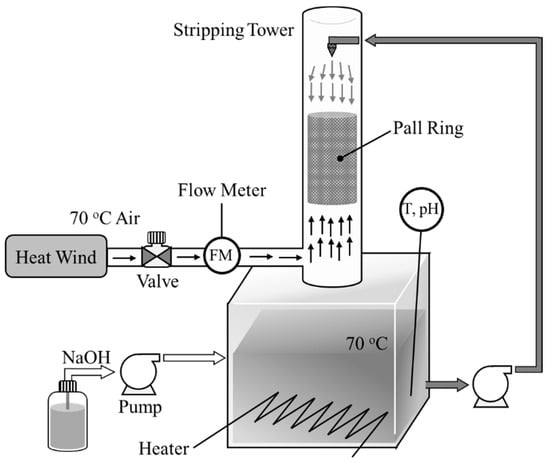 In the process of ammonia stripping, the mass transfer rate of ammonia () from liquid to gas phase is given by Equation (11) [,,].
