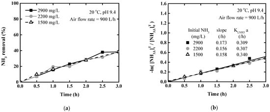 Figure 4b shows the natural logarithm of the relative change in total ammonia concentration against time; the slopes for each pH value were obtained by linear regression (R2 = 0.997, 0.980, 0.993, 0.989). As a result, the slope and mass transfer coefficient increased proportionally with increasing pH.