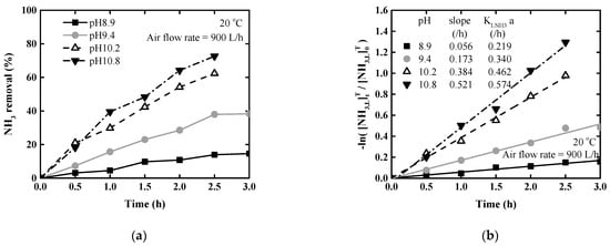 Ammonia stripping performance according to pH at 20 °C: (a) Ammonia removal rate; (b) logarithm of ammonia concentration ratio.