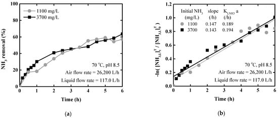 Ammonia stripping performance according to initial concentration at 20 °C and pH 9.4: (a) Ammonia removal rate; (b) logarithm of the ammonia concentration ratio.