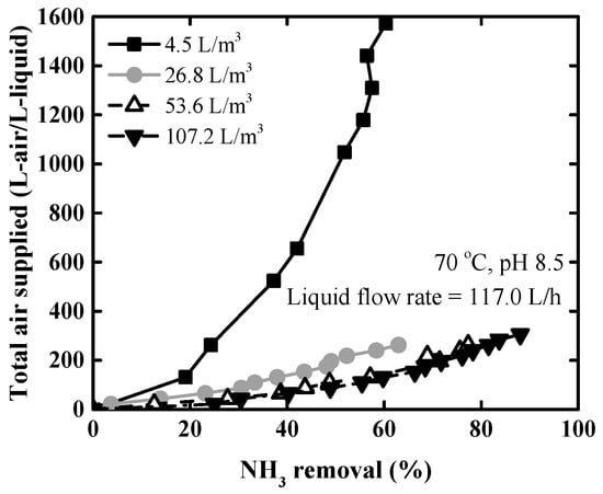 Figure 7 shows the total air supplied against the ammonia removal rate at different L/G ratios. Here, the total air supplied refers to the total cumulative air for 1 L of artificial wastewater. To compare the total air supplied according to L/G ratio, it was revealed that the lower L/G ratio, the greater the total air consumed at the same removal rate. The total volume of air required was 240 L/L liquid at 53.6 L/m3 and 212 L/L water at 107.2 L/m3 to achieve 76.1%, where the ammonia removal rate was equal to the ammonia fraction ( = 1). At L/G ratios of 4.5–26.8 L/m3, it is predicted that a greater volume of air will be required more than 1600 and 300 L/L liquid, respectively.
