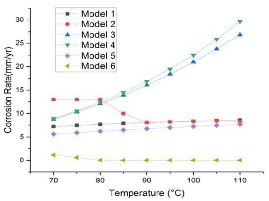 The aforementioned corrosion rate models do not include the interaction of chlorine ions and the corrosion effects. Whilst predictive software for pipeline corrosion is commercially available (11 commercial software packages), the results of each predictive package do not agree with each other. Even different versions of the same software have been known to give different corrosion rate results. There are many reasons for this, but it is clear that there is still a need for self-consistent predictive software for pipeline corrosion. Rolf Nyborg [22] has reviewed the models available to predict Corrosion rate in different CO2 partial pressures, temperatures, and other flow parameters, and the work concludes that all the models have limitations depending upon the philosophy used in developing these models. A general prediction of the corrosion rates is difficult as the corrodents and the environmental factors are varying in different field data. The work concludes that the prediction of corrosion rates by these models vary considerably from case to case—most models are successful in predicting their respective data, but very unsuccessful when predicting other field data. This is concluded in Figure 1 below, where six different models are analyzed by our research team, which is similar to the comparison done by Nyborg in his work, and the results show a large deviation in corrosion prediction in all these models.