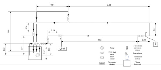 A circulating loop system, as shown in Figure 2, was used for measuring the corrosion rate. The schematic diagram of the flow loop and the actual flow loop are shown in Figure 3 and Figure 4. The flow loop consists of a plastic reservoir, a 0.50 horsepower/0.37 kW submersible pump (made of plastic) with a float switch, a pipe (made of PVC plastic) of internal diameter 28.9 mm and an outer diameter of 33.55 mm, PVC pipe fittings, PVC valves, a plastic calibrated flow meter, and the electrode test section. A 20 L test solution is supplied from the reservoir using the submersible pump, and the flow velocity is changed and continuously monitored using the flow meter. The entire flow loop is purposely made from plastic to make sure the only corroding component in the flow loop is the test specimen. The operating conditions are maintained in desired values, and the temperature of the test solution is varied from 25 °C to 40 °C (±0.5 °C) in the study and the operating conditions are maintained at desired values. The temperature is maintained using a heating and cooling system and continuously measured using a thermocouple and a mercury thermometer at infrequent intervals. The corrosion electrode system is connected to Gamry 600 potentiostat and a computer with Gamry instruments software. After mounting the electrode system in the flow loop, the required flow rate is obtained by adjusting the manifold valves in the loop and varying the amount of bypass, and monitoring the LPM values in the digital gauge. Once the flow is stable, the potentiostat is turned on, the readings can be recorded, and further analysis can be performed using the respective Gamry software. After recording one reading, the sample is removed and cleaned before continuing the experiments. There is a 2.02 m run of straight unaffected pipe, equivalent to 69 diameters, to allow for a fully developed flow to occur and for pump noise to dissipate. The test specimen is at the bottom of a vertical flow loop, as shown in Figure 4. This is to ensure that only single-phase flow impinges on the test specimen. On the top (return) side of the loop, there is an additional deaerator that catches bubbles and ensures that, after a few minutes of flushing, the loop has no trapped bubbles in it and is a single phase.
