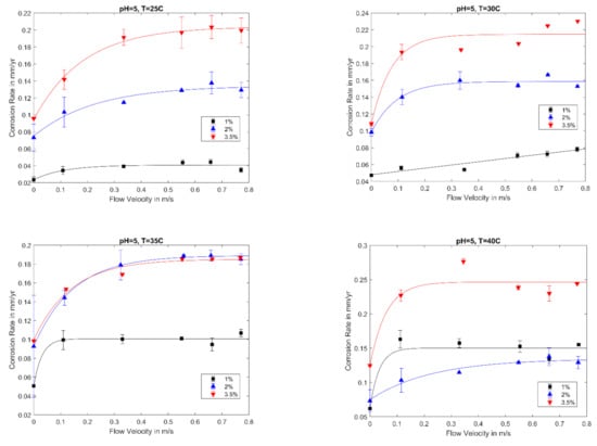 In this study, we investigated the effects of flow rate, temperature, pH, and NaCl concentration on corrosion rate by changing one of the parameters and keeping the other parameters constant. The study is conducted in two different pH levels, namely, pH-7 and pH-5. The pH is maintained by adding sodium acetate buffer solution and is monitored using a well-calibrated pH meter. The temperature of the feed solution is changed from 25–40 °C every 5 °C degrees, the flow rate of the solution in the loop is varied from 0–0.8 m/s (Reynolds number up to 22,000), and the salt concentration of the solution is varied from 1% to 3.5% by adding NaCl. The effect of velocity on corrosion rate has been studied previously, and the application of these findings in practical flow systems is very difficult. The corrosion rate and its relationship with flow velocity varies differently for different metals and alloys; thus, it is very challenging to form a specific conclusion. The changes in velocity alter the oxygen supply to the material and remove corrosion products from the specimen surface, thus resulting in different corrosion rates. Generally, at low flow rates, the corrosion rate will be uniform at the surface, and at higher flow rates, corrosion will be more localized, resulting from the formation of oxygen concentration cells. At higher flow rates, corrosion rates can sometimes increase because of increased oxygen supply and can decrease due to the destruction of thermal and concentration gradients. Here are the corrosion rate results, obtained from the flow loop of Figure 4.