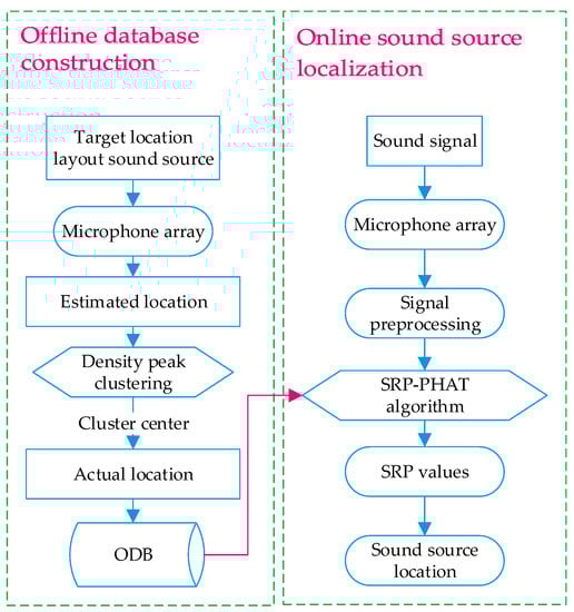 Based on this, the authors put forward an improved procedure called ODB-SRP-PHAT to decrease the computational load and maintain the robustness. The new procedure consists of two steps, i.e., offline database construction and online sound source localization, as shown in Figure 1.