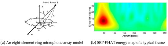 We assumed that the sound source is in the far field, and the localization algorithm only estimates the direction of arrival (DOA) of the sound source. In a spherical coordinate system, the search ranges of the azimuth (θ) and elevation (φ) are 0–359° and 0–90° respectively, where the search space mesh has increments of 1°, and each mesh point is a candidate orientation q(θ, φ). Figure 2a shows an eight-element uniform ring microphone array with a diameter of 20 cm. Figure 2b illustrates the SRP-PHAT energy map, i.e., SRP values, obtained by analyzing a certain frame of the signal collected by the microphone array. In Figure 2b, the darker the color is, the greater the SRP value becomes. The position of the darkest color (47°, 33°) is estimated as the sound source location. For the convenience of further analysis, we use () to represent the estimated location of the i-th sound source by analyzing the j-th frame of the signal, and use () to represent the actual location of the i-th sound source.