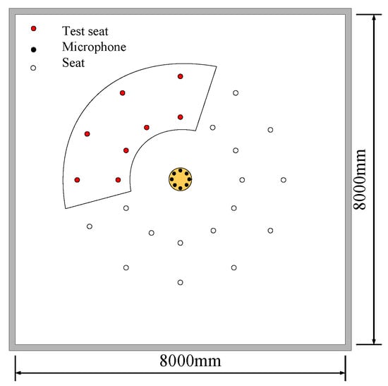 In the simulations, there were 24 seats in a round conference room with the dimensions 8 m × 8 m × 3 m (length × width × height). A circular microphone array consisted of eight omnidirectional microphones with a radius of 0.1 m, which was located at the center of the room, i.e., the co-ordinates being 4 m, 4 m, and 0.6 m, as shown in Figure 3. Voice signals were selected randomly from the TIMIT database [25], with the length of 3 s and a sampling rate of 16 kHz. The sound source was sequentially placed at eight different seats marked in red in the upper left area of the room, and the height was set as 1.7 m. The impulse responses of the room were generated by the image method [26], which were convoluted with the voice signals to simulate reverberation. Various reverberation durations were considered, i.e., 20, 300, 500, 700, and 900 milliseconds. Gaussian noises were also added into the signals to consider different SNRs, i.e., 5, 10, 15, 20, 25, and 30 dB.