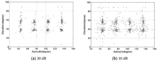 If the estimated locations of all frames for a sound source are plotted as dots in a coordinate system with θ as the abscissa and φ as the ordinate, the dots can be regarded as sample points. It was found that the sample points distributed in a different range due to the change of the noise and reverberation. The lower the signal noise ratio (SNR) is and the longer the reverberation time is, the more dispersive the distribution of sample points is, and vice versa. The closer to the actual location () the place is, the larger the density of the sample points is, and vice versa. For each sound source location, the sample points distributed in a cluster, and the densest position of the cluster was typically the actual location of the sound source.