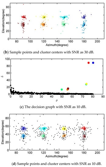DPC was used for analyzing the sample points to accurately localize the sound source. In Figure 6, the identified cluster centers (sound sources) are marked as a with the reverberation time being 300 ms and the SNR being 10 dB and 30 dB respectively. Table 1 and Table 2 give out the identified coordinates of cluster centers with the reverberation time as 300 ms corresponding to different SNRs and the SNR as 30 dB under different reverberation durations respectively. It can be seen that the coordinates were completely consistent with the actual location of sound sources when the reverberation time was relatively short, e.g., 20 ms or 300 ms, and the SNR was high, e.g., 25 dB or 30 dB. Even under strong reverberation or heavy noise, e.g., 900 ms or 5 dB, the error did not exceed 2 degrees (see the bold figures). This proved that DPC could efficiently remove the effects of reverberation and noise and locate the sound source accurately.