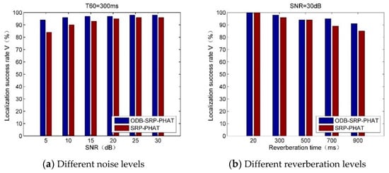 When the reverberation time was 300 ms, the results of localization under situations of six different SNRs are shown in Figure 7a. When the SNR was 5 dB, V was only about 80% for SRP-PHAT, which was much smaller than that for ODB-SRP-PHAT. ODB-SRP-PHAT exhibited good performance of localization even under extremely low SNRs. The higher the SNR, the bigger the value of V for both methods. When the SNR was 30 dB, V approached 100%.