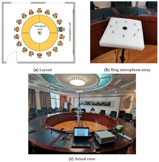 A series of tests in a real environment were conducted to verify the efficiency of ODB-SRP-PHAT. A conference room with the dimensions of 8.7 m × 7.5 m × 2.8 m in a university was chosen as the test field, in which a round table had 18 seats as shown in Figure 8. A circular microphone array consisting of eight omnidirectional microphones (MPA416) with a radius of 10 cm was placed at the center of the round table, at the height of 2.2 m as shown in Figure 8. The reverberation time and the averaged SNR were approximately 0.4 s and 16 dB, respectively, by estimation.