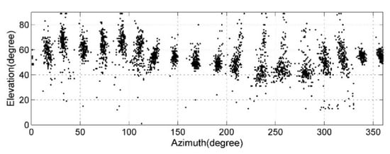 Then, DPC was used to deal with the sample points and, finally, 18 clusters were formed. The centers of the clusters were stored in the ODB. As shown in Figure 10 and Table 4, the azimuth space between any two adjacent sound sources was approximately 20°, which was essentially consistent with the actual situation. There were deviations for sound source elevation and the dispersion was relatively big. This was partly due to the relatively low elevation resolution of the circular microphone array placed horizontally. In addition, the plate mounted with the microphone array tilted to some degree and was difficult to align. However, since the plate of the microphone array was kept at the same location and tilting status for both the offline database construction and the subsequent online localization, the results were not greatly affected.