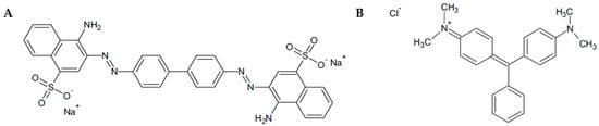Among diverse synthetic dyes, Congo red (CR) and malachite green (MG) are two of the most commons due to their low cost, high availability, and efficacy. CR is the sodium salt of benzidinediazo-bis-1-naphthylamine-4-sulfonic acid (C32H22N6Na2O6S2; molecular weight: 696.66 g mol−1) (Figure 1A). It is an azo acid dye that is very soluble in water, which directly stains cotton in red; it may also turn blue by the presence of mineral acids. CR is also used for staining some products in the wood pulp and paper industry [7,8]. MG, the most common basic dye (N-methylated diaminotriphenylmethane; C52H54N4O12; molecular weight: 927.00 g mol−1) (Figure 1B), has been widely used as a bactericide and fungicide in the fish farming industry, in the coloring of silk, and as a food coloring agent and additive [9,10].