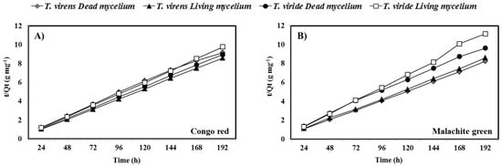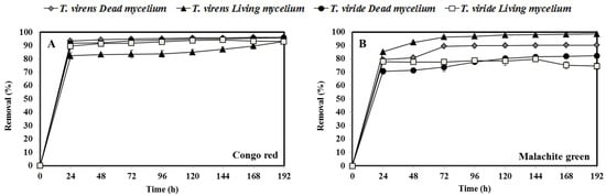 On the other hand, after 24 h, the dry biomass of both Trichoderma species showed higher CR removal capacity than activated carbon (Figure 4A). In addition, the CR removal obtained by the dry biomass of T. virens (88%) was higher than that reported for the fungus Aspergillus niger (72%) [73]. In contrast, MG removal by the dry biomass of both fungi was lower than that observed by activated carbon during the first 24 h, although, at 48 h, the removal of MG by the dry fungal biomass was similar to that observed for activated carbon (Figure 4B).