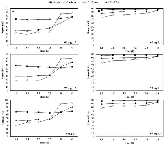 Figure 4 shows removal efficiencies for CR (Figure 4A) and MG (Figure 4B), for the more representative dye concentrations, as a function of stirring times ranging from 1.5 to 48 h. It is important to note that removal by activated carbon is very fast for both dyes and remained almost unchanged during the experimentation time, indicating that it reaches the equilibrium faster than the mycelium of both Trichoderma isolates. As it can be seen, during the first 24 h, the activated carbon showed the highest CR removal capacity. In absorption processes, activated carbon is a highly effective and versatile material. However, both chemical and thermal regeneration of the used carbon produces effluent, is expensive, and is impractical on a large scale.