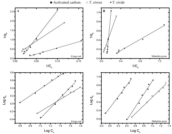 Equilibrium adsorptions data of CR and MG onto activated carbon and dry biomass of the two Trichoderma species were analyzed using the Freundlich (Equation (2)) and Langmuir (Equation (3)) adsorption isotherms. The isothermal plots were found to be linear, and the linear correlation coefficients were slightly higher for the Langmuir model (Figure 5); all the calculated isotherm model parameters are given in Table 2.