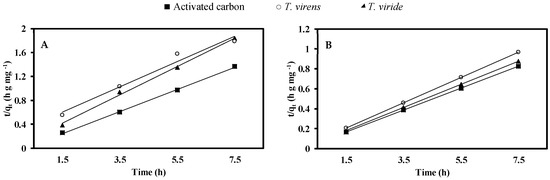 On the other hand, the kinetics studies reveal that adsorption rates of CR and MG by activated carbon and dry biomass of T. virens and T. viride are adequately described by the pseudo-second-order rate model (Figure 6). Table 5 shows the values obtained from the linear regression plots (t/qt vs. t) using the pseudo-second-order model, for the different concentrations of both dyes, finding that qe tends to increase along with Ce in the three adsorbents tested in this study; the highest values of qe were obtained with activated carbon.