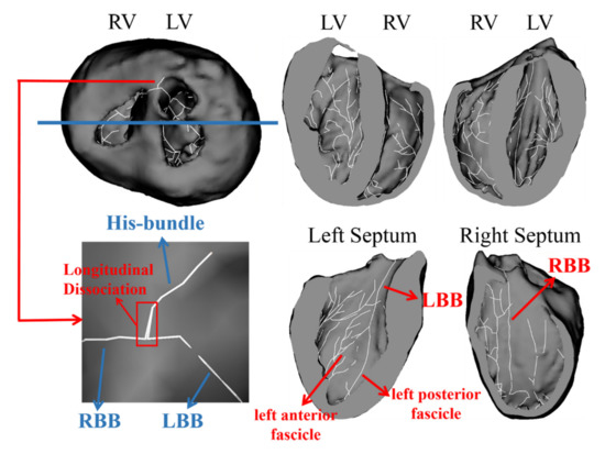 A detailed His-Purkinje system was integrated in the ventricular model. The His-Purkinje system model was generated according to the method proposed by Costabal [18], which had been applied in many modeling studies [19,20]. In this method, the two-dimensional fractal tree network was first generated, and was then projected on the endocardium by a two-step projection method to form the Purkinje network on the ventricular model. To conduct the physiological pacing simulations more efficiently, the following details were noted in the construction of the His-Purkinje system in this manuscript: We added an extra branch on the top of the Purkinje network to represent the His-bundle. Previous studies had indicated that the left and right bundle branches have separated within the His-bundle [21]. The longitudinal dissociation is the reason HBP can correct the bundle branch block that occurs within the His-bundle [22]. Therefore, we constructed the structure in which the left and right bundle branches were dissociated within the His-bundle. There are left and right bundle branches, and the left bundle branch divides into the left anterior and the left posterior fascicles. The His-Purkinje system model we generated contained 369 branches and 146 terminals, and its morphology was consistent with its true physiological structure. Figure 1 illustrates the optimized rabbit ventricular model with the His-Purkinje system model. The gray part and the white network represent the myocardium and the His-Purkinje system model, respectively. The endocardium was connected with the Purkinje network model by Purkinje-muscle junctions (PMJ).