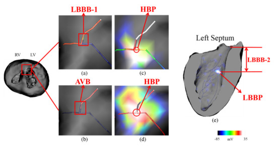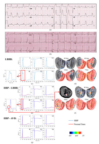 We performed HBP to correct LBBB-1 and AVB, respectively. This was equivalent to the restoration of the function of His-bundle. To conduct HBP, we applied a stimulus that started at 31 ms at the distal end of the His-bundle, which was beyond the bundle block position, as shown in Figure 2c,d. ECG simulations were carried out for LBBB, LBBB correction with HBP, and AVB correction with HBP.
