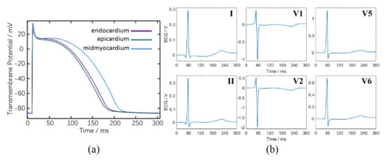 Figure 3a shows the simulated APs of the cells from the endocardium, epicardium, and midmyocardium, recorded under steady state. The action potential duration (APD) of the midmyocardial cells was the longest, and the APD of the endocardial cells was slightly longer than that of epicardial cells (208 ms in the midmyocardial cells vs. 196 ms in the endocardial cells, and 187 ms in the epicardial cells).