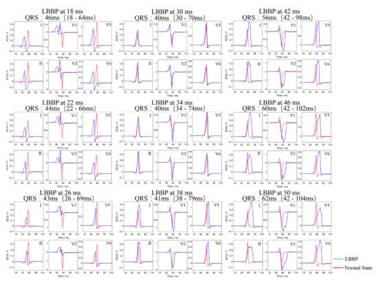 In this case, although LBBB-2 occurred in the left main bundle branch, it still yielded a similar synthetic ECG as that in Figure 4c. With the existence of a normal beat from His-bundle, we performed LBBP at different moments. The synthetic ECGs under LBBP varied morphologically. Given that the variations on the QRS complex were more obvious than the variations on the T wave, we used the QRS complex for analysis. Figure 5 indicates respective QRS complexes and the QRS duration for each specific moment, compared with the referenced synthetic ECG of the normal state. The duration of the QRS complexes of these simulations were 21%, 16%, 13%, 5%, 5%, 8%, 47%, 58%, 63% longer than that of the synthetic ECG of the normal state, respectively. The synthetic ECGs of LBBP starting at 18 ms, 22 ms, and 26 ms had RBBB morphologies, and those of LBBP starting at 30 ms, 34 ms, and 38 ms appeared to be basically synchronous, while those of LBBP starting at 42 ms, 46 ms, and 50 ms possessed LBBB morphologies. The best pacing results were obtained when LBBP started at 34 ms. Morphologically, the synthetic ECG of this situation was extremely consistent with the normal synthetic ECG.