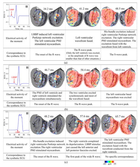 We present the simulated activation sequences of three typical situations (LBBP starting at 18 ms, 34 ms, 50 ms), as shown in Figure 6. Figure 6a shows the results of the situation in which the LBBP stimulus started at 18 ms, i.e., at 12 ms earlier than the proximal His-bundle excitation. The right ventricle was excited after the left ventricle and resulted in an RBBB. Regarding the best pacing situation, the pacing was 4 ms later than the proximal His-bundle excitation, as shown in Figure 6b. The entire conduction process of the wavefront was very similar to that in the normal state, which indicated that LBBP corrected LBBB successfully and led to a physiological-like rhythm. Figure 6c shows the results of the situation in which the LBBP stimulus started at 50 ms, i.e., at 20 ms later than the proximal His-bundle excitation. The left ventricle was excited after the right ventricle. This caused an LBBB. Therefore, LBBP failed to correct the LBBB in this situation.
